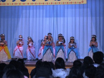 幼稚園のクラスを半分に分け、午前と午後で 練習の成果を発表する。 | 有佳里は年少組の「ペンギン組」。合唱とお遊戯の2つの発表がある。 クラス担任の先生が、曲目選び、振り付け、衣装製作と全てひとりでこなすと言う。 先生によって、出来栄えがこんなに違ってくるんだと びっくり〜〜。 「あら どこだ」の合唱が始まった。大きな声で歌うペンギン組の22人の子供達。 ここ しばらくして ペンギン組の女の子13人で踊るお遊戯が始まった。 振り付けの内容も年少組にしては、難しいと思える程の変化にとんだ踊りだった。 素晴らしい出来栄えに感動した。 ひとみ先生の苦労が報われた瞬間だね。 子供たちが大好きというプリンセス風の衣装。 ピンク、ブルー、黄色の 3色を作り、こども達に好きな色を選ばせたと言う。有佳里はブルーのドレス。 お姫さまになりきって踊るみんなが可愛くて、可愛くて。。。ビデオは ここ こんなに手のこんだロングドレスを作ったひとみ先生に脱帽! 年少組、年中組、年長組の演技をビデオにまとめてみた。 ここ と ここ 1月から練習を毎日続けてきて、頑張って発表した子供達に拍手はもちろんだけど、 企画から、衣装作り、指導にと どんな大変な思いをして、この日を迎えたのだろうと。。。 先生達に 大拍手を送りたい。 頭が下がる思いだった。 |