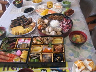 家に戻って、宇都宮から持参のおせちと煮物、キンピラ牛蒡、イガ蒸しなどや、 | はなちゃんが持ってきてくれた千葉の美味しい「鮭の押し寿司」などで お昼を食べた。 その時の写真を写すのを忘れたので、1月1日料理の写真を。。 貞治が送ってくれた「ホテルグランヴィア大阪」特製の2段重のおせちと、 美映が持ってきた紀文のおせち、そして私が作った煮物とお雑煮など。。。 なますは紅白にならないように人参を入れずに大根だけで作った。 喪中なので紅白の蒲鉾など、おめでたい物は食べないようにした。