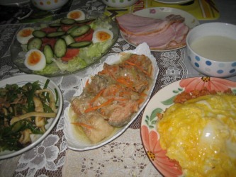 きのう(土)の夜はオムライス、コーンポタージュ、鎌倉ハムと子供達が好みそうな献立と | 鮭のマリネ、ピーマンとえりんぎのシーチキン炒めにした。