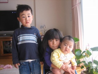 朝大は、冬の乾燥のため、アトピー性の皮膚炎がひどくなり、ほっぺが真っ赤にただれて | しまうので、ガーゼで保護していたが、やっぱり痒いらしく泣いてぐずる事が多かった。 そんな朝日を有佳里が、お姉さんらしく面倒を良くみていた。 でも、抱っこして歩きまわり、床に落として、ママに叱られる事もあった。 朝大は成長が早く、ひとりでお座りも出来るようになっていた。 もうすぐ、つかまり立ちも出来そうな感じだった。 しゃべり出すのが、遅くて心配していた光汰朗は、びっくりする程、 おしゃべりが上手になっていた。 お姉ちゃんの話し方を真似して可愛かった。 |