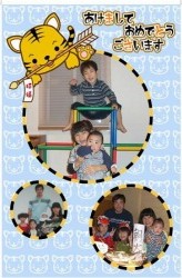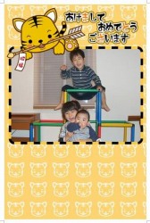 美映家族の年賀状をワードで作成した。 美映から頼まれてから年賀状サイトを色々見てみた。 その中から気に入ったデザインをDLして写真を入れて、何枚か作ってみた。 年賀状用に美映からパソコンに届いた写真は10枚。 ジャングルジムとソファーに座った有佳里、光汰朗、朝大の3ショット写真だったが。。。 年賀状に使えると思う3人揃っていい表情の写真はジャングルジムの1枚だけだった。 その1枚だけを使った年賀状を2種類作ってみた。 次に前に送ってもらったお宮参りの時の写真とお食い初めの時の家族5人の写真も 入れてみた年賀状を作ってみた。 私としては写真が3枚入りの年賀状のデザインが気に入ったので また、3人のいい写真が撮れたら送ってと頼んだ。そしたら作りなおすよと話した。