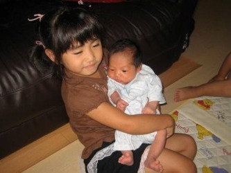 有佳里の幼稚園が明日から夏休み、今日が最後との事でスモック姿を写真に。。 朝大が可愛くて仕方がない有佳里は、暇さえあれば、抱っこしたがる。 5歳で、まだ甘えたい盛りなのに、2人のお姉さんになった。 光汰朗に絵本を読んで聞かせている様子をビデオに撮った。 そのビデオは ここ 新体操のシャンプー(足の先を頭につけるポーズ)を特訓中の有佳里。そのビデオは ここ そして私のホームページを、パソコンを操作して自分で見ている事が分かった。 自分の小さな時のビデオ、写真を見て楽しんでいるみたい。 まさか、こんなに早く、ひとりで「有佳里のページ」を見るようになるなんて。。。 HPをアップするのに、張り合いが出ると嬉しくなった。 「光汰朗のページ」の赤ちゃんの時の写真を、クリックして大きくして見ていた。 今の光汰朗と全然違うと言っているビデオは ここ |