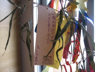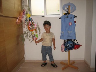 今日は七夕。有佳里は幼稚園で作った七夕飾りを持って 帰ってきた。 さっそく、記念にパチリ! 何でもお姉ちゃんの真似をしたがる光汰朗も 写真に撮ったら満足そうな顔をしていた。(笑) 短冊に書いてあった有佳里の願いは 「ピアノがじょうずにできますように」 最近、ピアノを買ってもらった有佳里は、 楽しそうにピアノの前で弾いている。 幼稚園のお友達から「ミッキーマウスの歌」を ドレミで習ってきたと、弾いてみせた。 そのビデオは ここ そのうち、ピアノ教室に通うらしい。 |